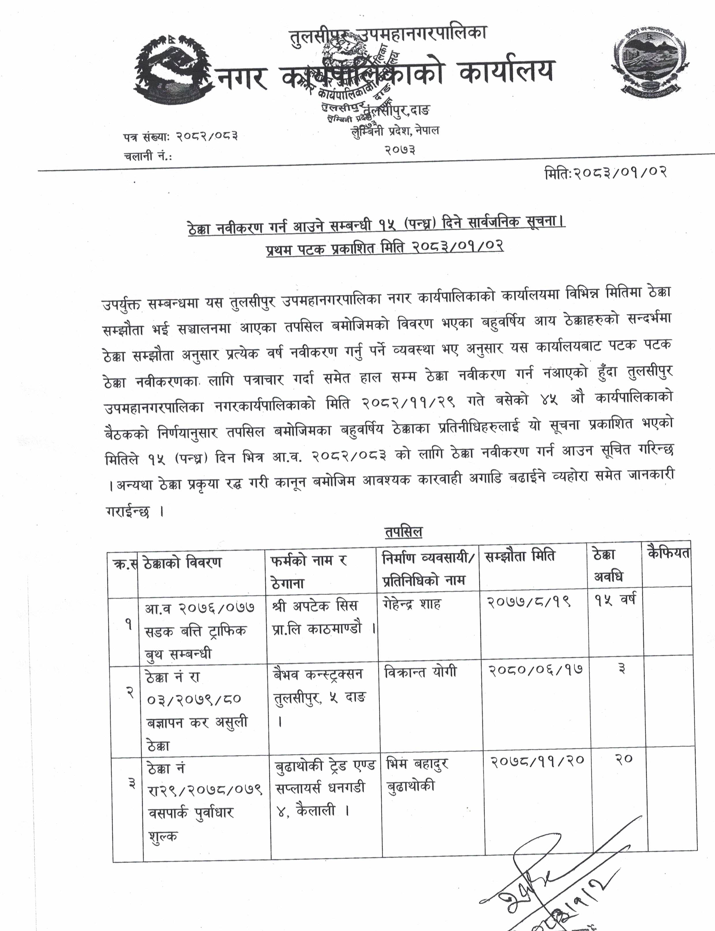 ठेक्का नविकरण गर्न आउने सम्बन्धी १५ दिने सार्वजनिक सूचना -२०८३-०१-०२