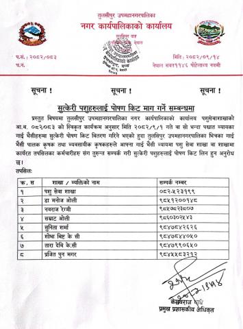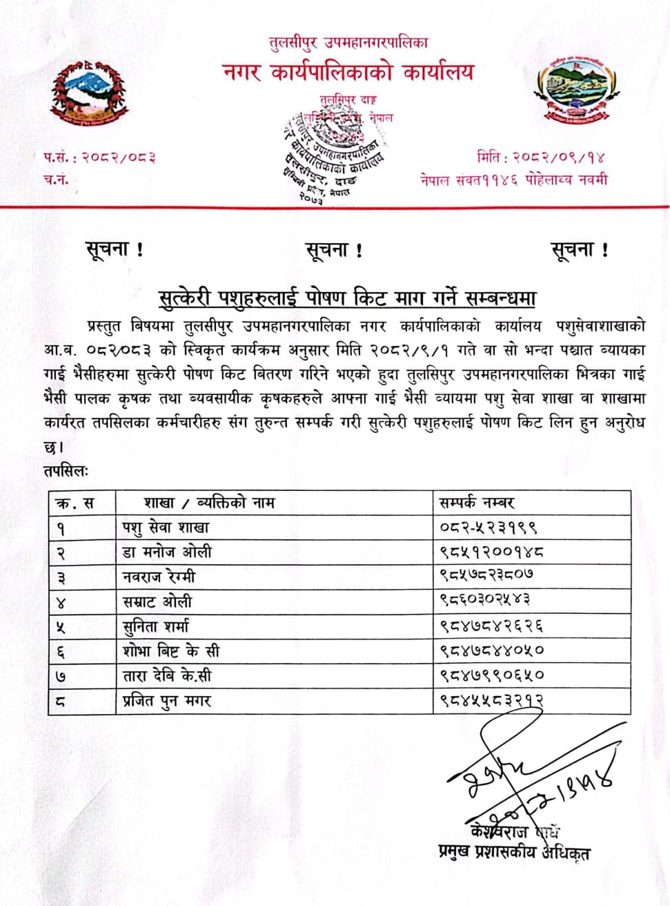 सुत्केरी पशुहरुलाई पोषण किट माग गर्ने सम्बन्धी सूचना २०८२/०९/१४