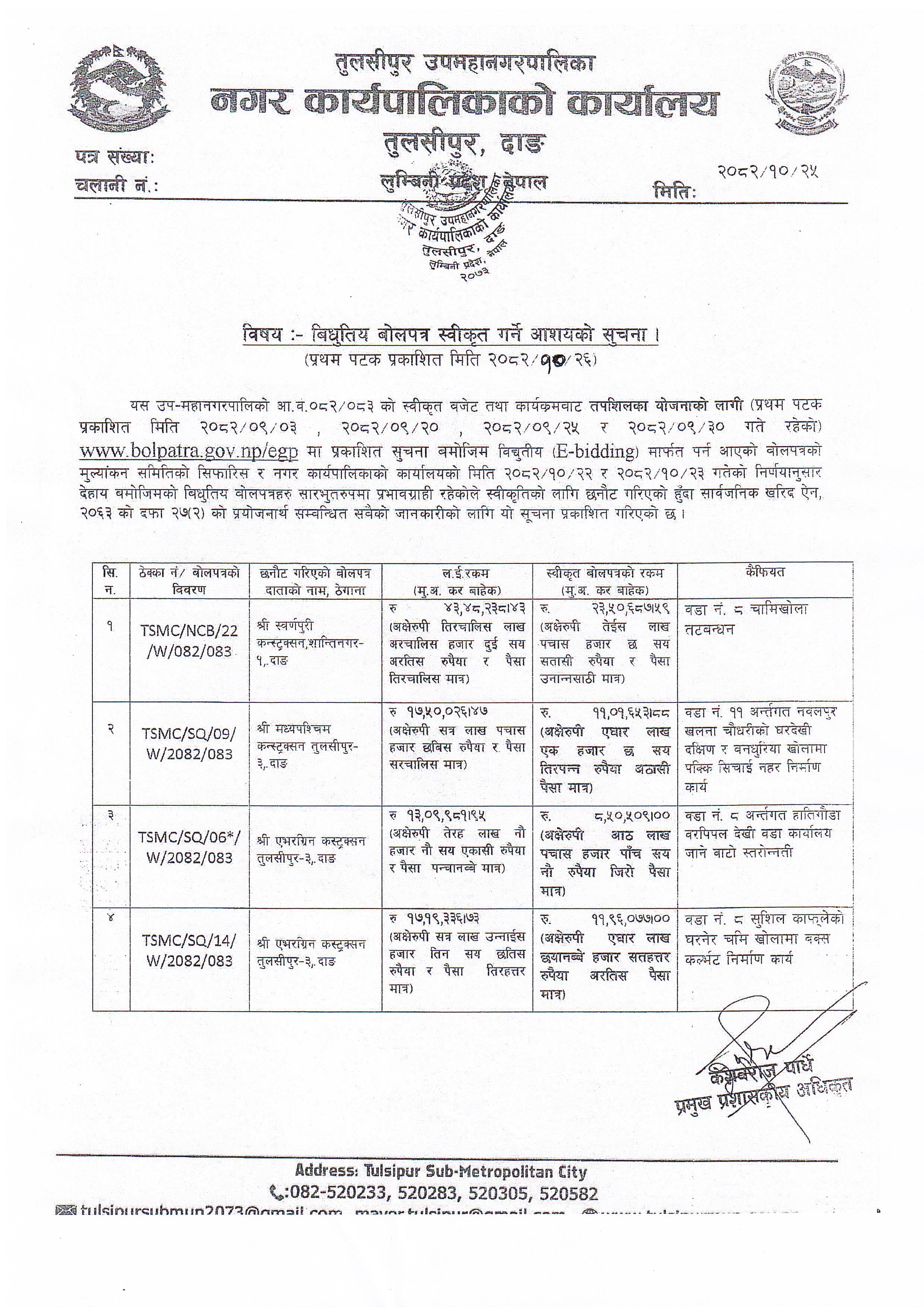विद्युतीय बोलपत्र स्वीकृत गर्ने आशयको सूचना प्रथमपटक प्रकाशन मिति २०८२-१०-२६