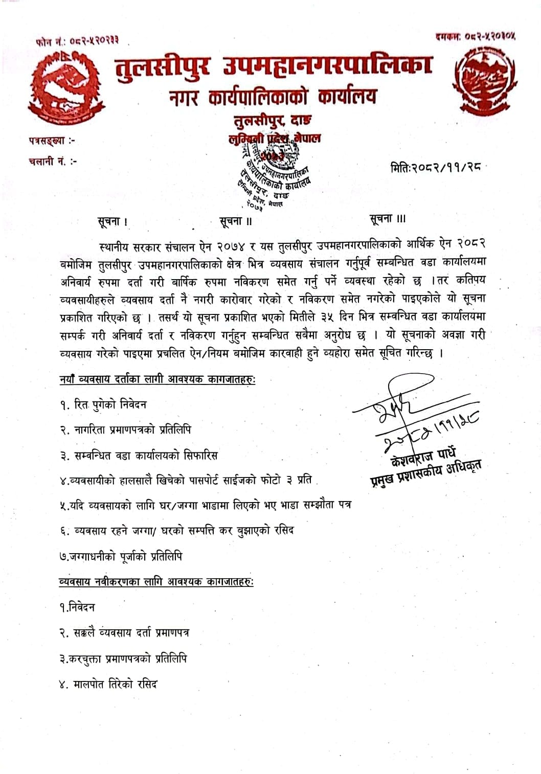 » व्यवसाय दर्ता तथा नविकरण सम्बन्धि सूचना