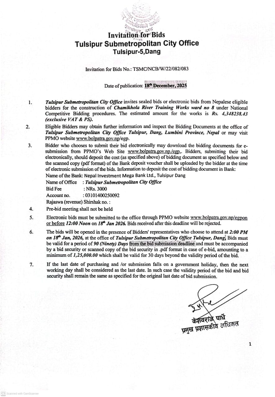 बोलपत्र स्वीकृत गर्ने आशय सम्बन्धी सूचना .. प्रथम पटक प्रकाशित मिति : २०८२/०८/२५