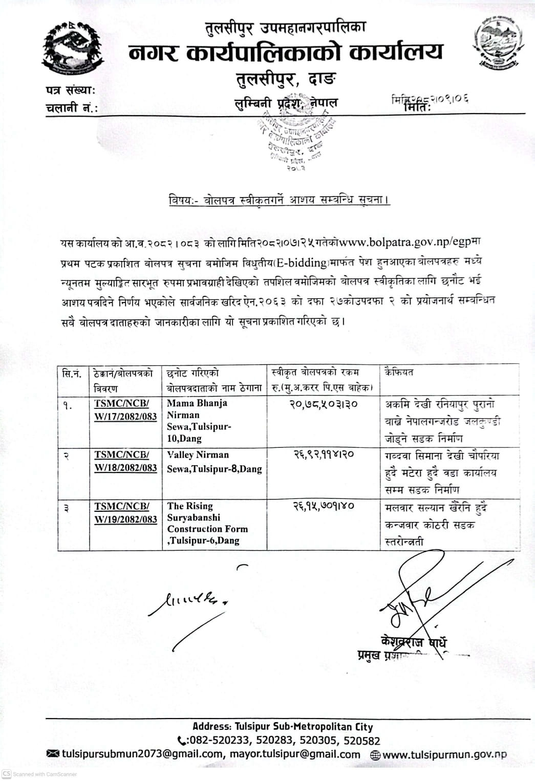 बोलपत्र स्वीकृत गर्ने आशय सम्बन्धी सूचना .. प्रथम पटक प्रकाशित मिति : २०८२/०९/०६