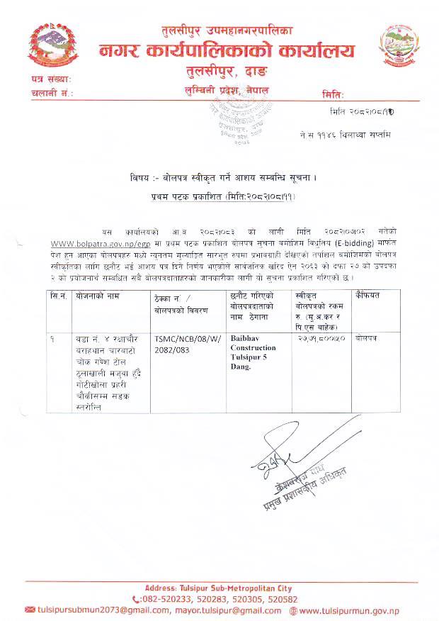बोलपत्र स्वीकृत गर्ने आशय सम्बन्धी सूचना २०८२/०८/०११