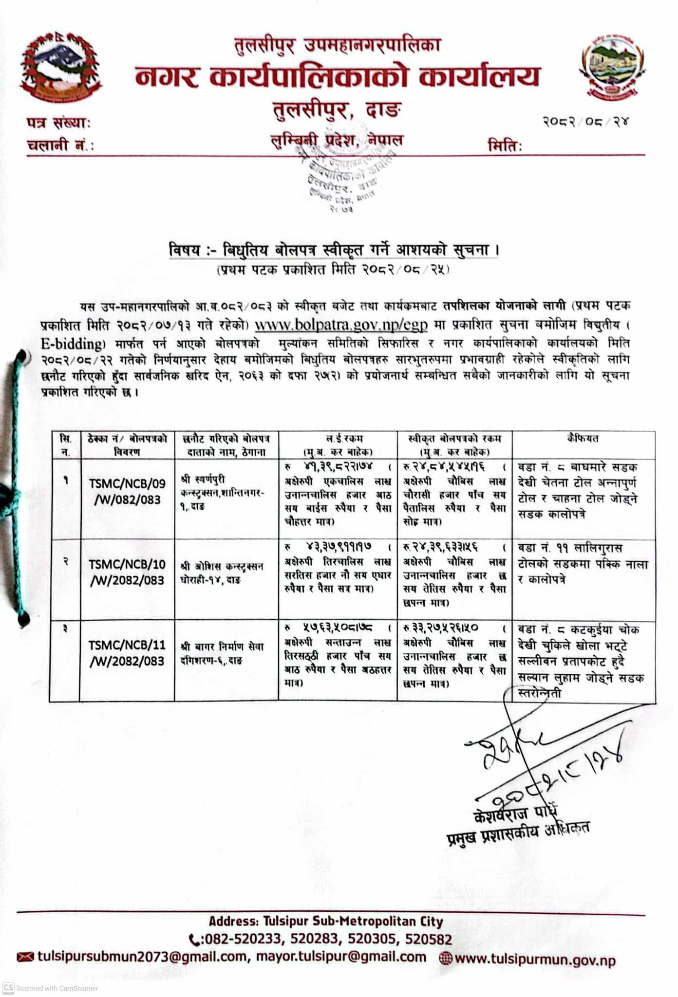 विद्युतीय बोलपत्र स्वीकृत गर्ने आशयको सूचना .... प्रथम पटक प्रकाशित मिति : २०८२/०८/२५