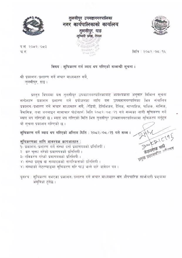 » सूचीकरण गर्न म्याद थप गरिएको सम्बन्धी सूचना.. २०८२/०८/१६