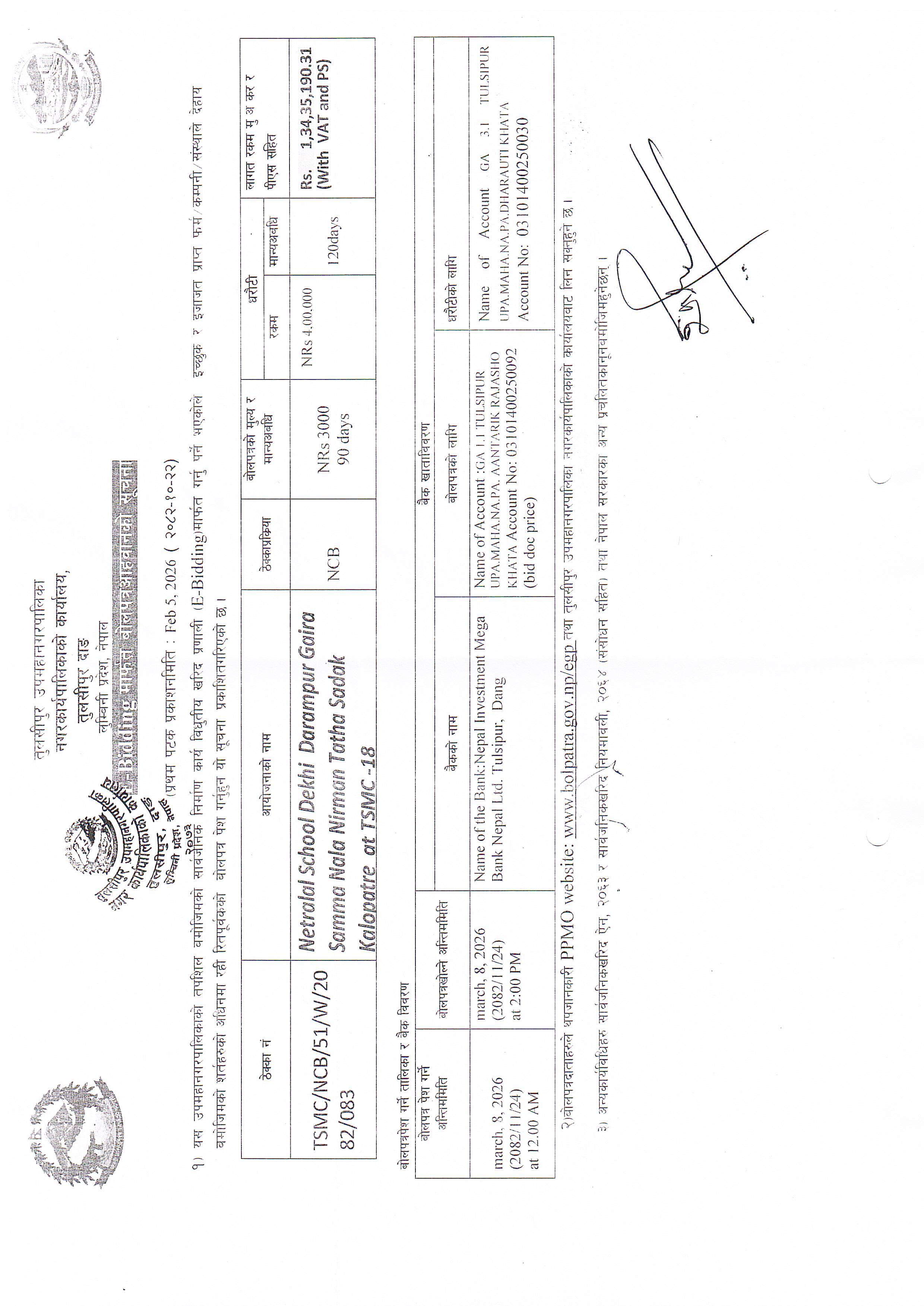 E-Bidding मार्फत बोलपत्र आव्हानको सूचना .. प्रथमपटक प्रकाशन मिति : २०८२/१०/२३