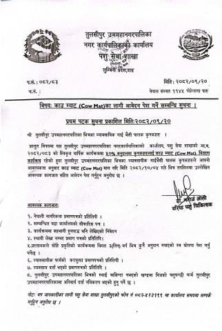 काउ म्याट (Cow Mat) का लागि आवेदन पेश गर्ने सम्बन्धी सूचना २०८२/०९/२०