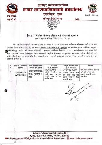 विद्युतीय बोलपत्र स्वीकृत गर्ने आशयको सूचना.... प्रथम पटक प्रकाशित मिति : २०८२/०९/०७