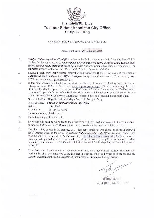 E-Bidding मार्फत बोलपत्र आव्हानको सूचना प्रताप पटक प्रकाशन मिति : २०८२/०९/३०